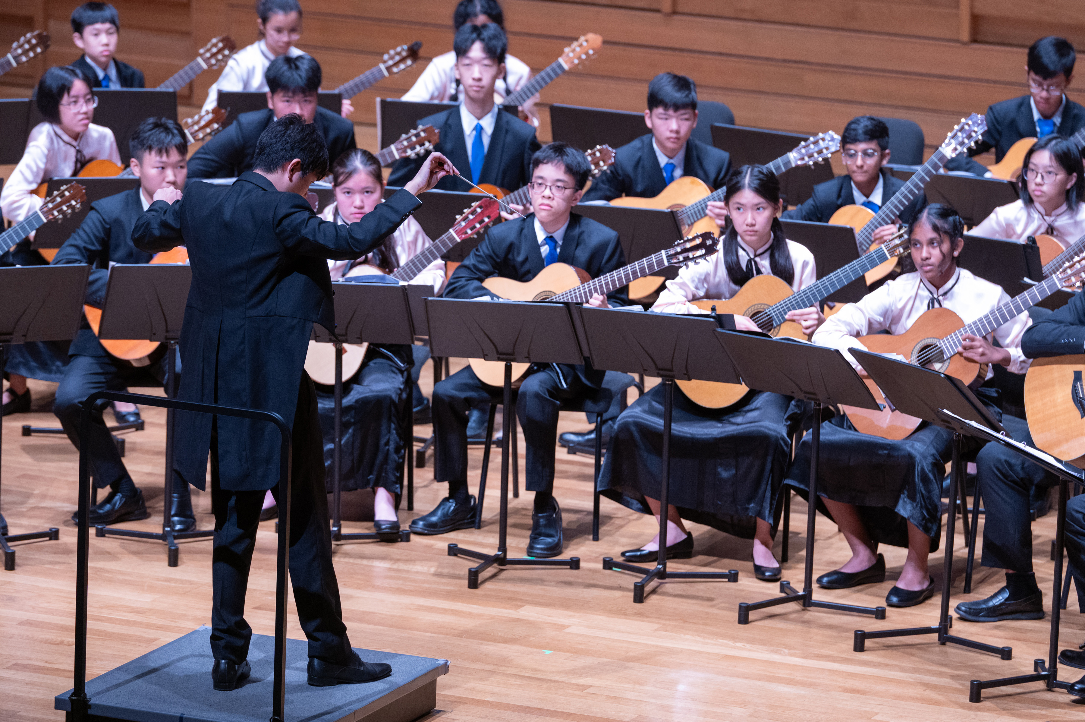 The School of Science and Technology, Singapore (SST) Guitar Ensemble was established in 2010 to introduce students at SST to classical guitar music. In 2012, the Ensemble expanded to include members playing Niibori guitars from Japan, enabling a richer and more versatile sound palette through the combination of Japanese and Spanish guitar timbres. Since its inception, the Ensemble has grown steadily in both size and artistic maturity, while remaining a close-knit community of young, passionate musicians. Over the years, the Ensemble has become a family of 60 guitarists.